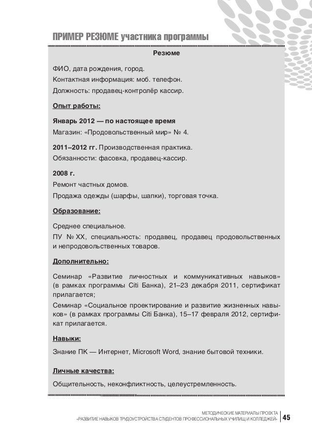 Резюме / Департамент занятости и экономического развития МиннесотыНачатьНезависимо от того, с чего вы начинаете писать резюме, вам сначала нужно организовать и сохранить в электронном файле множество различных типов информации, связанной с работой. История занятостиПеречислите все свои рабочие места за последние 10–15 лет в обратном хронологическом порядке с указанием дат работы и различных должностей, занимаемых в различных компаниях. Если у вас было много работ или у вас была разнообразная карьера, перечислите последние три или четыре должности и пропустите предыдущую карьеру или сократите ее в одну строку: «США. Банк, Миннеаполис, Миннесота, кассир, 2005–2010 гг. » Навыков Возьмите список из 20 профессиональных навыков, которые вы определили, используя информацию в главе 3.Будущие работодатели хотят знать, какие навыки вы проявили в своей работе, и помогли ли эти навыки сэкономить деньги, повысить эффективность, повысить мотивацию сотрудников или что-то еще. достижений / достиженийПенелопа Транк, автор поиска работы, призывает вас взглянуть на свои прошлые работы и «перечислить достижения, а не должностные обязанности … любой может выполнять работу, но достижения показывают, что вы выполнили свою работу хорошо.«Показателен случай, когда соискатель пишет:« Управлял двумя людьми и создал систему отслеживания для маркетинга ». Вместо этого рассмотрите следующее: «Управлял командой, которая построила систему отслеживания, чтобы снизить маркетинговые расходы на 10 процентов». Второй пример, очевидно, звучит более впечатляюще. Использование заявлений о достижениях помогает нанимающему органу понять, как вы оказали положительное влияние на бизнес-операции или результаты. Марк Заппа, который работает в Центре рабочей силы Миннесоты, отмечает, что достижение может быть фактическим свидетельством руководителя — отличным отходом от обычной стандартной информации в резюме. Цели поиска работыУстановите четкие цели поиска. В какой компании вы хотите работать? Какой размер? В какой области? Какую работу вы ищете? После выполнения этих шагов у вас будет список ваших предыдущих должностей, дат трудоустройства, имени и адреса работодателя, а также список из не менее 20 ваших профессиональных навыков и навыков общения. Напиши это В хорошем резюме есть важные элементы содержания, которые должны быть полными и убедительными. Есть несколько общих рекомендаций для демонстрации вашего опыта и навыков на одной или двух страницах текста. Резюме довольно предсказуемы по характеристикам и информации, но необходимо сделать некоторый выбор. Обычно это не документы, используемые для демонстрации вашего новаторского дизайна или творческих навыков письма. Теперь мы собираемся разбирать резюме, раздел за разделом и даже построчно. Начнем сверху, закончим внизу. Пока не беспокойтесь об окончательном виде или формате вашего резюме. Начните с основного содержания. Получив эту основную информацию, вы можете точно настроить или настроить каждое резюме для каждой вакансии. Это называется «нацеливанием» на ваше резюме. Выбор шрифта Есть два типа шрифтов: с засечками и без засечек. У шрифтов с засечками есть хвосты или ножки, а у шрифтов без засечек — нет. Используйте шрифт с засечками для своего имени, потому что этот стиль часто выглядит более за